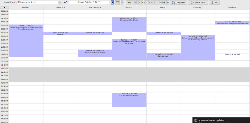 TRADESBase Pro has a full appointments diary, allowing you to make appointment then with a click of a button send the customer a SMS and/or an email reminder. This can be done even while you are on the phone to your customer - providing an excellent professional image - you ofcourse need an internet connection to send either an Email or SMS message.